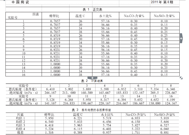 本研究選用原料組成、溫度、水土比、碳酸鈉和硅酸鈉作為影響粘度因素,用恩氏粘度計和旋轉粘度計分別對陶瓷泥漿的恩氏粘度和**粘度進行測定。原料組成即為配方,其水平值可用瘠性原料量與塑性原料量之比表示,簡稱瘠塑比 ;溫度即為泥漿的溫度,其水平值